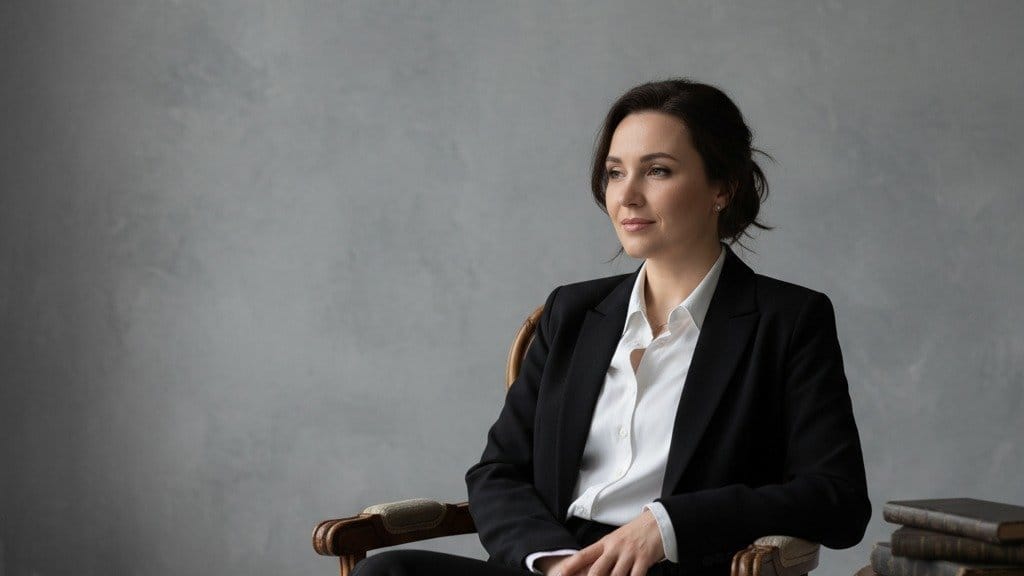 “A confident woman in a black blazer and white shirt, arms crossed, serious yet approachable expression, bright gray background, corporate headshot style.”