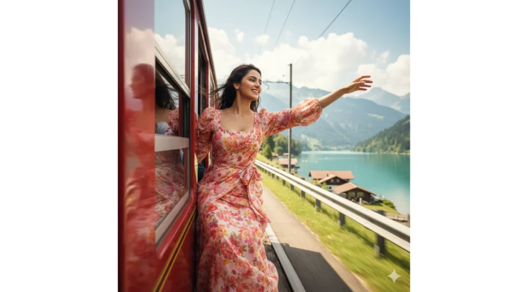 Gunakan fitur photo transform untuk menciptakan gambar perempuan duduk di dalam kereta wisata Swiss dengan tangan menjulur ke luar jendela merasakan angin. Ia memakai saree chiffon bermotif bunga dengan pita di pinggang, tersenyum menikmati pemandangan Danau Brienz berwarna toska dan pegunungan di kejauhan. Rambutnya berkibar lembut, cahaya sore yang hangat, gaya fotografi sinematik, hasil ultra-realistis.