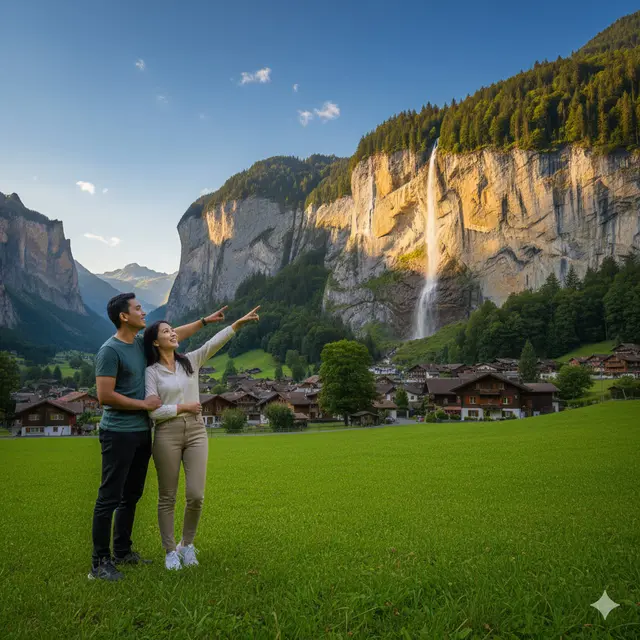 Lauterbrunnen Valley adalah salah satu tempat paling fotogenik di dunia. Dikelilingi tebing curam dengan Air Terjun Staubbach menjulang tinggi di atas desa chalet kecil, pemandangannya seperti dongeng nyata.