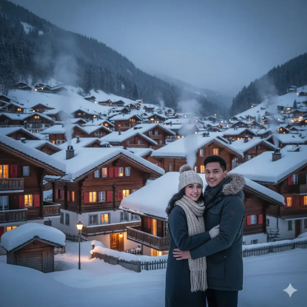 “Traditional Swiss chalet village in winter, covered in snow at dusk. Warm yellow lights glowing from windows, thin smoke rising from chimneys, cozy Christmas vibe, high-detail realistic photography. –ar 3:4”