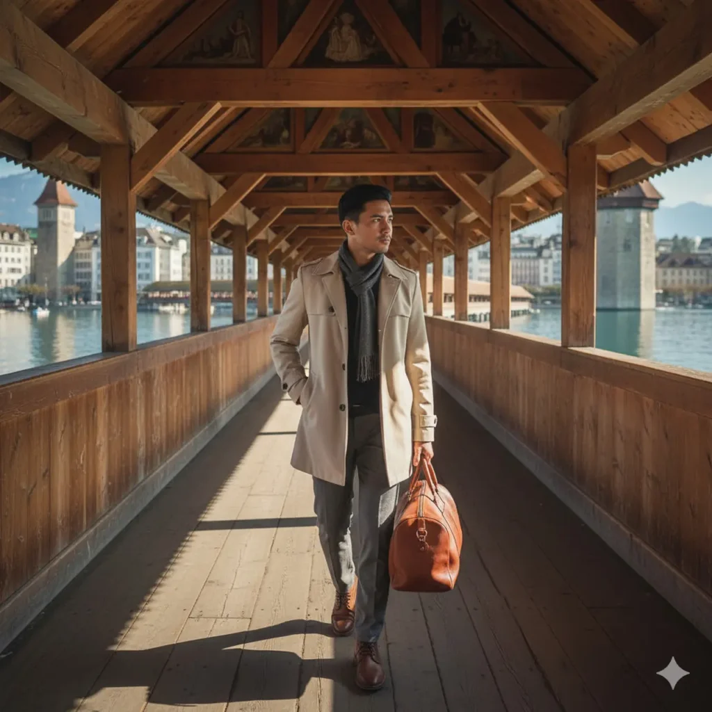 Jembatan Kapellbrücke di Lucerne adalah ikon arsitektur Swiss yang menawan. Kombinasikan dengan fashion modern untuk menciptakan tampilan editorial berkelas.