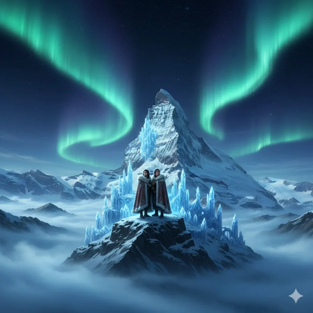 “Fantasy digital art of an ice crystal castle atop the Matterhorn, glowing blue mist across the valley, northern lights shining above, ultra-detailed surreal painting with cool icy tones. –ar 4:5”