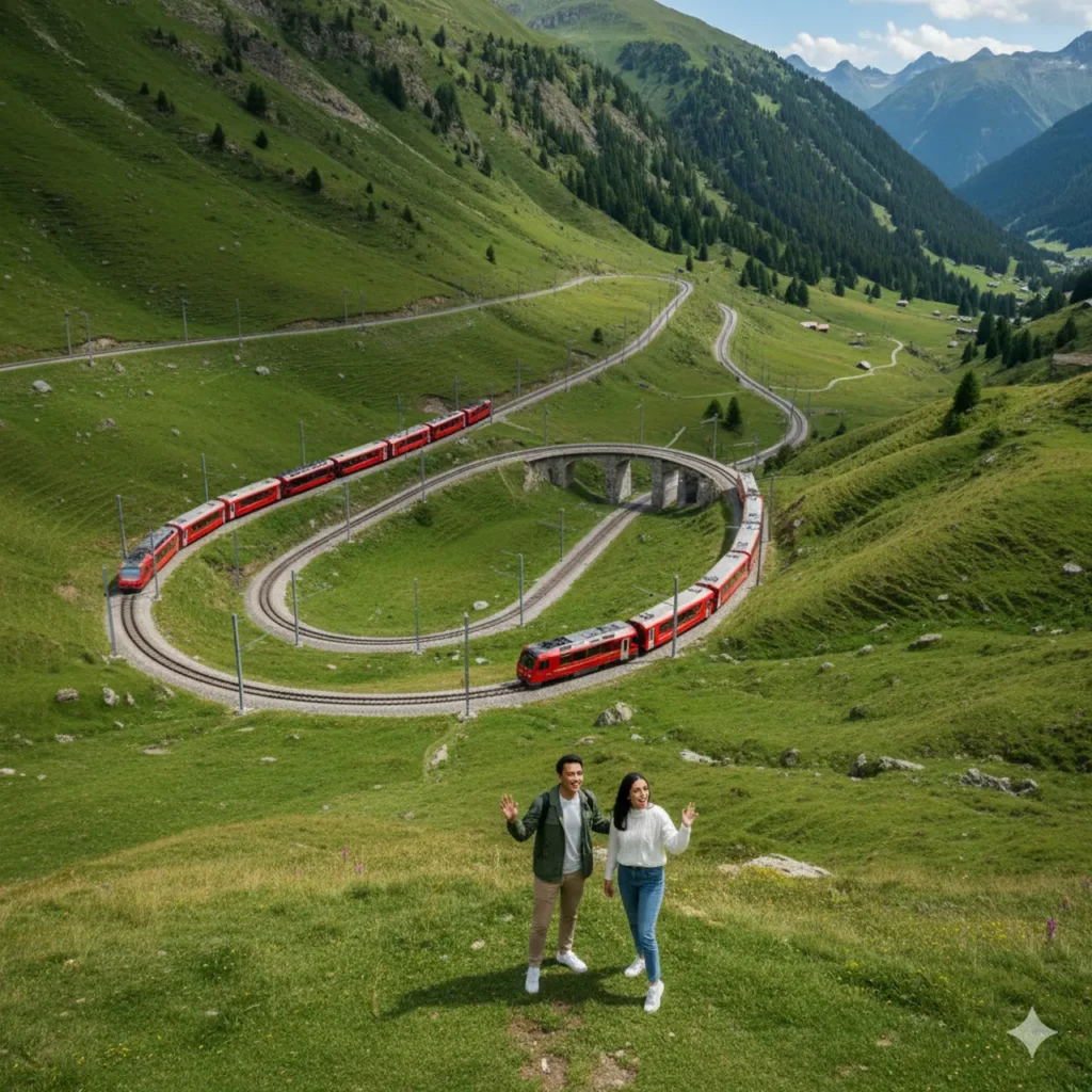 Glacier Express adalah kereta legendaris yang melintasi lembah curam dan jembatan batu di Swiss. Untuk menciptakan kesan megah, gunakan prompt dengan angle tinggi (bird’s-eye view) agar lintasan kereta terlihat jelas di antara lanskap pegunungan.
