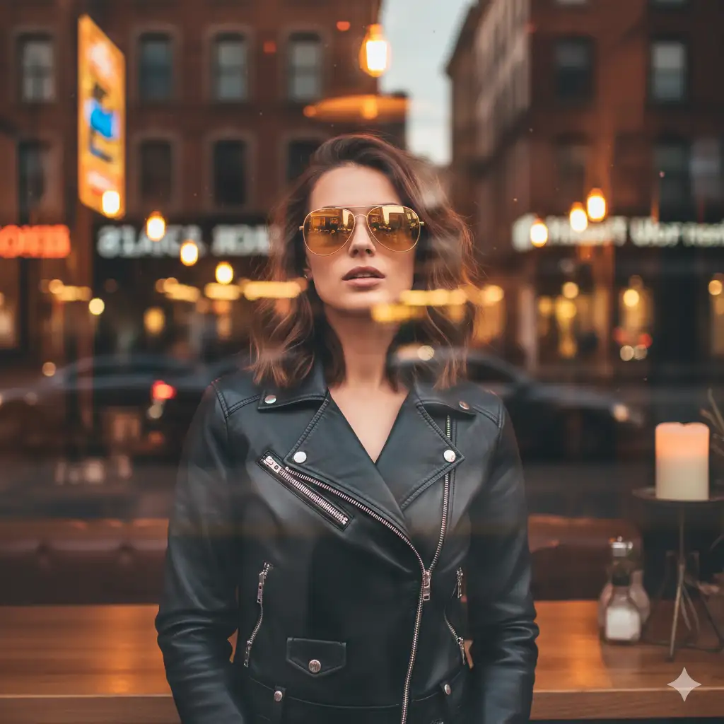 Buat potret stylish seorang wanita berdiri di belakang jendela kaca di café atau bar urban, ditangkap dalam cahaya hangat menjelang malam. Dia mengenakan jaket kulit hitam sleek dengan ritsleting metalik dan kacamata aviator oversized berwarna amber yang memantulkan lampu kota — mirip suasana café hits di daerah SCBD, Bandung, atau Surabaya. Rambut coklat berantakannya membingkai wajah secara natural, dan ia menatap percaya diri ke kamera dengan ekspresi santai sedikit terbuka. Refleksi di kaca menambah kedalaman dan suasana urban sinematik, memadukan bokeh lampu kota dan kilau dari luar. Adegan terasa intim namun dinamis, menggabungkan gaya street fashion modern dengan kehangatan interior café.