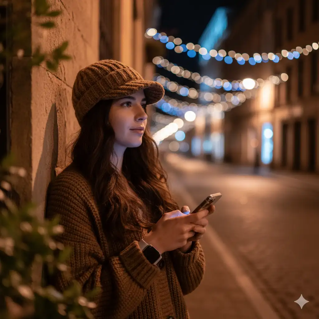 Buat potret malam sinematik seorang wanita muda berdiri di luar ruangan di depan dinding yang diterangi lembut oleh lampu jalan. Dia memiliki rambut panjang bergelombang gelap dan mengenakan cardigan rajut coklat dengan topi rajut tekstur serasi — gaya cozy yang umum di daerah dataran tinggi seperti Bandung, Malang, atau Bogor. Ekspresinya tenang dan reflektif. Ia memegang smartphone di satu tangan dan memakai smartwatch, memberi sentuhan modern pada tampilan klasik. Latar belakang menampilkan bokeh lampu kota berwarna emas, biru, dan pink. Beberapa daun hijau muncul di foreground, memberi kedalaman natural pada komposisi.