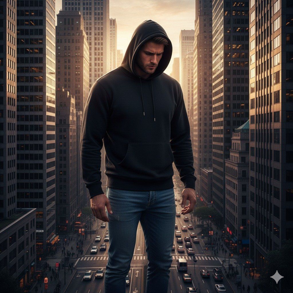 Sosok raksasa berdiri di kejauhan menghadap gunung berapi aktif. Asap tebal membumbung, warna merah-oranye dari lava menyinari tubuhnya. Wajah serius dengan pakaian sederhana dari kain gelap. Nuansa dramatis dan intens.