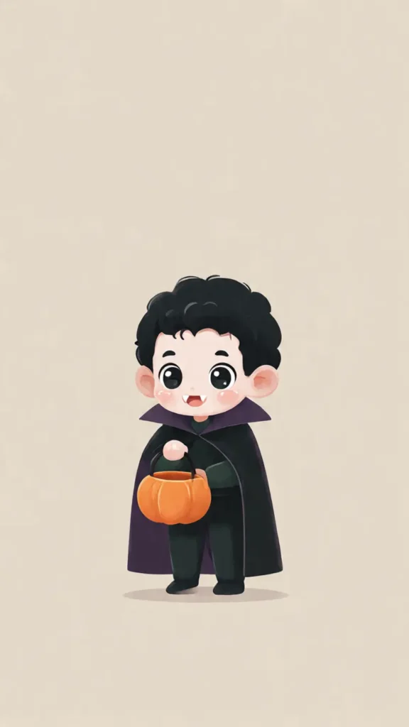 “Create a cute halloween character of a [jenis karakter], chibi style with big expressive eyes and friendly expression, soft color palette (orange, black, purple, green), minimal simple background, digital illustration, clean vector art.”