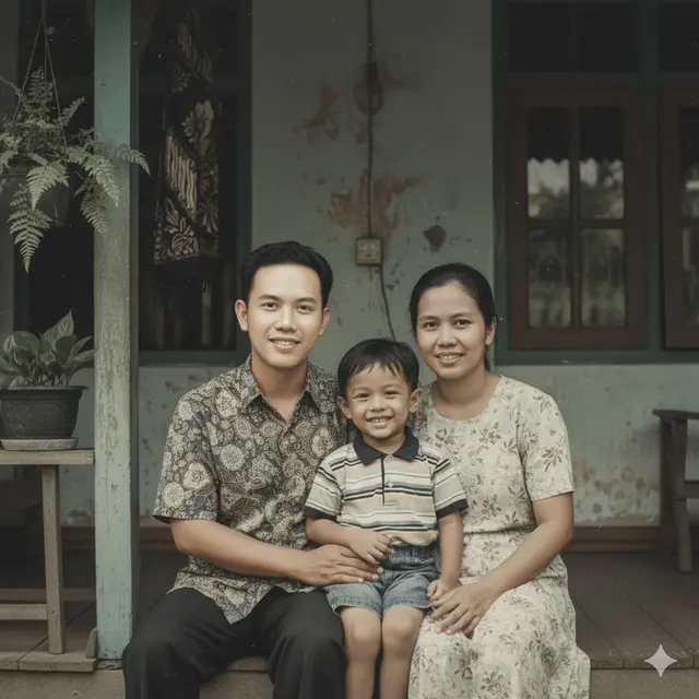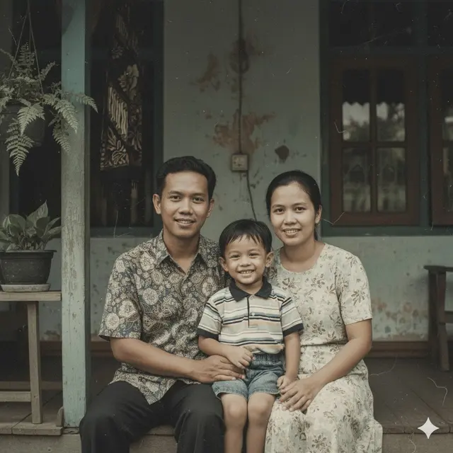 “Tingkatkan kualitas foto keluarga yang pudar dan bernoda. Pulihkan detail realistis pada wajah, mata, rambut, dan ekspresi setiap anggota keluarga. Jaga latar belakang tetap utuh dengan pencahayaan lembut dan bayangan natural.”