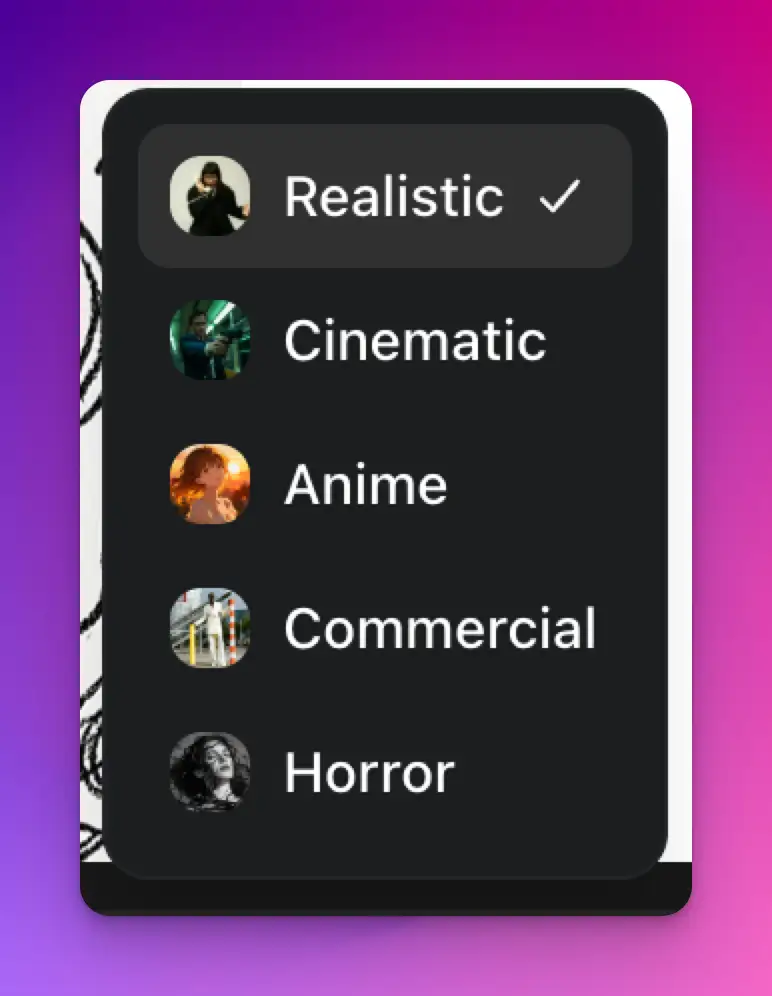 Setiap gaya mengubah sketsa Anda menjadi video dengan nuansa berbeda. Misalnya, ketika penulis mencoba sketsa karakter devil dalam gaya anime, AI menghadirkan interpretasi yang hidup — ekspresi tajam, efek cahaya, dan nuansa anime yang kuat.