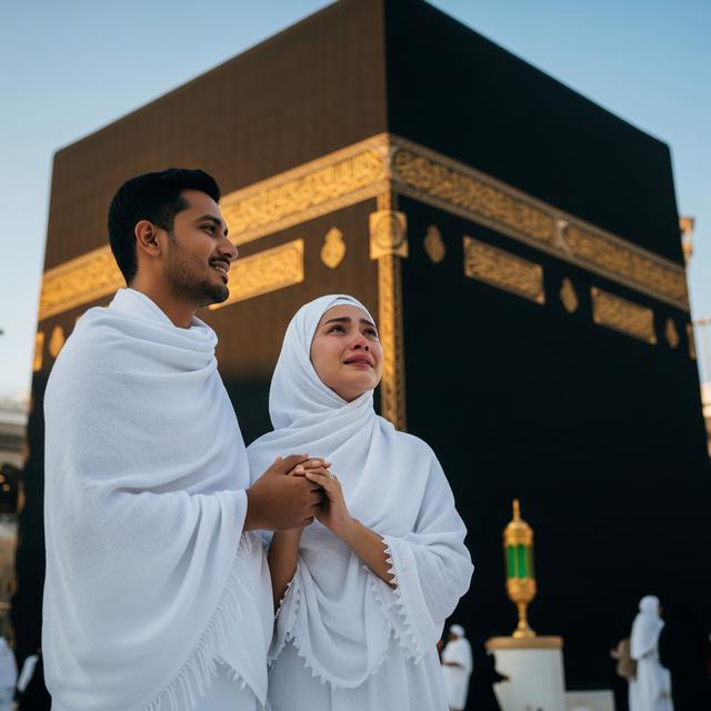 “Sepasang suami istri muslim mengenakan pakaian ihram berdiri berdampingan di depan Ka’bah. Sang suami menggenggam tangan istrinya sambil tersenyum haru, sementara sang istri menatap Ka’bah dengan mata berkaca-kaca. Langit cerah, dan cahaya matahari sore menyoroti sisi Ka’bah yang bersinar lembut.”