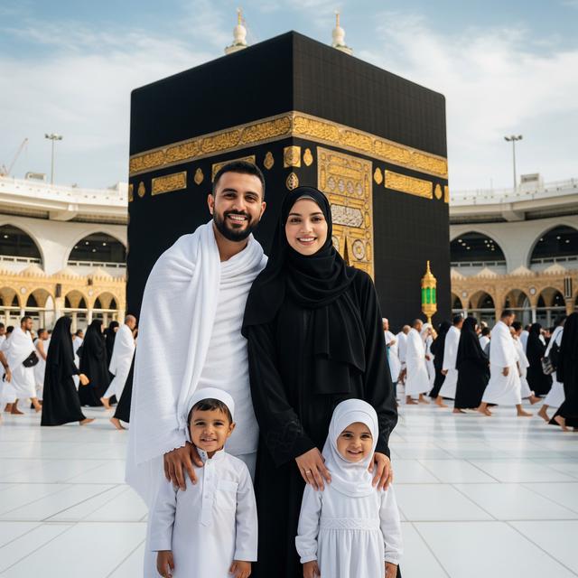 “Satu keluarga muslim terdiri dari ayah, ibu, dan dua anak kecil sedang berfoto di depan Ka’bah. Ayah mengenakan ihram putih, ibu memakai abaya hitam dan kerudung panjang, sementara anak-anak mengenakan busana putih sederhana. Mereka tersenyum bahagia, dengan latar jamaah tawaf dan Ka’bah berdiri megah di belakang.”