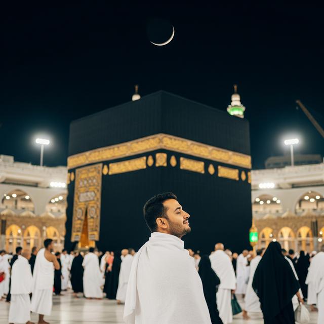 “Foto seseorang mengenakan ihram putih sedang berdiri di depan Ka’bah pada malam hari. Lampu-lampu Masjidil Haram menerangi Ka’bah yang tampak bercahaya. Langit malam gelap dengan bulan sabit di atasnya. Wajah orang tersebut memancarkan ketenangan dan rasa syukur mendalam.”