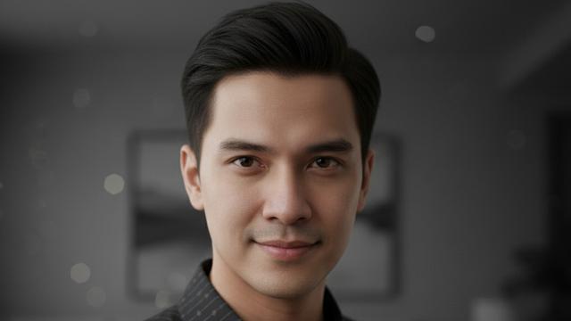 “Foto close up wajah dengan pencahayaan lembut yang menonjolkan fitur wajah alami dan ekspresi mata yang percaya diri namun ramah. Latar belakang blur dengan warna monokromatik (abu-abu gelap atau hitam) untuk kesan profesional. Fokus pada tekstur kulit yang realistis, senyum ringan, dan gaya rambut rapi alami. Gunakan kemeja batik gelap elegan dengan kerah terbuka. Hasil akhir sinematik dengan tone lembut.”