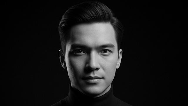 “Foto close up hitam putih dengan pencahayaan chiaroscuro dramatis, menciptakan kontras tajam antara area terang dan gelap. Fokus pada ekspresi mata intens, detail kulit realistis, dan bayangan lembut di sisi wajah. Latar belakang hitam pekat dengan tekstur minimal. Gaya rambut slicked back, mengenakan turtleneck hitam atau kemeja polos gelap. Hasil akhir sinematik dengan efek grain halus seperti film klasik.”