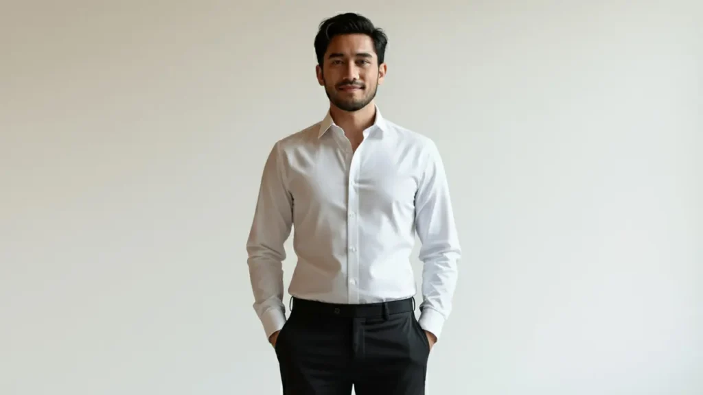 Pastikan kamu memakai pakaian rapi — seperti kemeja putih atau blazer gelap — agar hasil kontras dengan latar belakang.