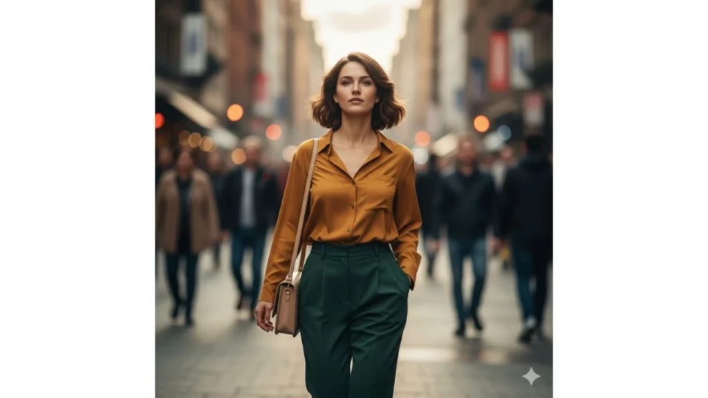 “Wanita berambut bergelombang pendek berjalan di jalan sibuk, mengenakan kemeja kuning mustard longgar dan celana hijau tua berlipit tinggi. Ia membawa tas krem di bahunya, sementara latar belakang dipenuhi orang-orang yang bergerak cepat. Fokus tetap pada wajahnya yang tenang. Pencahayaan alami siang hari yang sedikit redup, dengan warna hangat dan efek bokeh halus.”