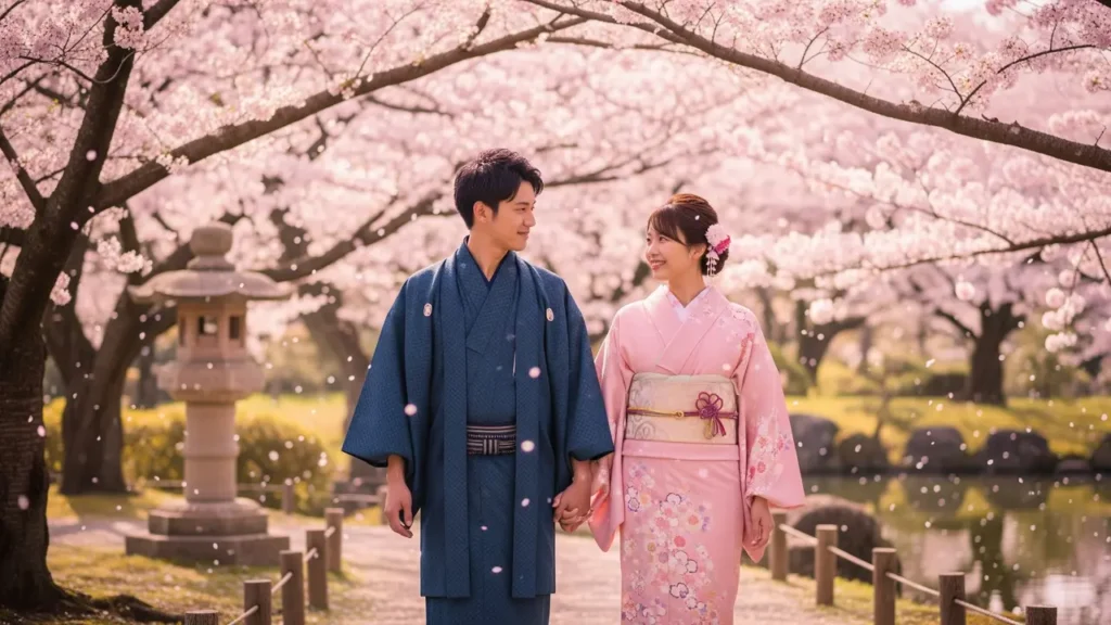 Prompt: “Sepasang kekasih berjalan di bawah pohon sakura mekar. Kelopak jatuh perlahan, mengenakan kimono tradisional. Ekspresi lembut, cahaya sore hangat, palet pink lembut, depth of field dangkal.”
