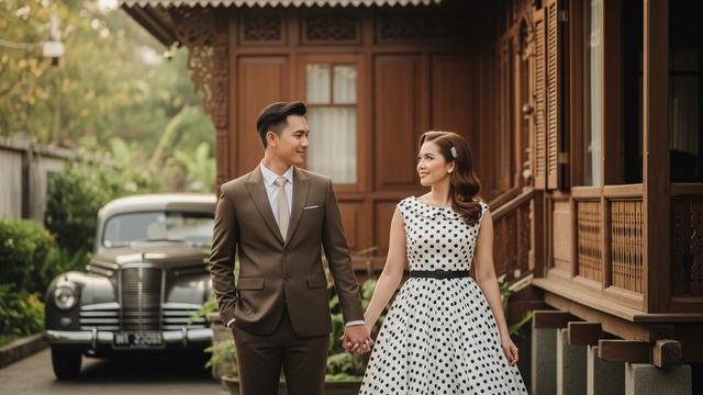 Prompt: “Pasangan bergaya 1950-an di depan rumah kayu klasik, mobil tua di belakang. Dress polkadot & jas cokelat, palet warna lembut, pencahayaan alami, sentuhan film grain retro, pose elegan penuh cinta.”