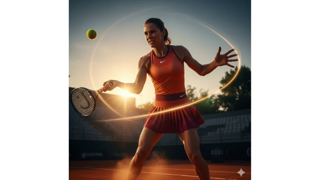 “Foto sinematik ultra-realistik pemain tenis wanita saat melakukan servis di lapangan tanah liat. Gunakan pencahayaan matahari senja dengan warna keemasan, ekspresi fokus dan penuh tenaga, serta efek motion blur halus pada bola dan raket. Debu halus di udara menambah kesan gerak. Gaya fotografi editorial, latar belakang kabur dengan depth of field yang lembut, dan efek HDR untuk hasil tajam.”