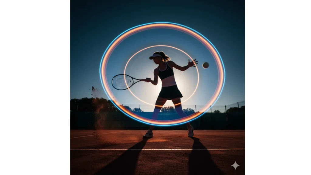“Foto sinematik 8K pemain tenis sedang melakukan ayunan kuat. Fokus tajam pada wajah dan tubuh, efek motion trail di tangan dan bola, serta pencahayaan senja yang hangat. Tambahkan efek debu di udara, lens flare lembut, dan bayangan panjang di tanah. Tone warna dramatis dan realistis, hasil akhir menyerupai foto majalah olahraga profesional.”
