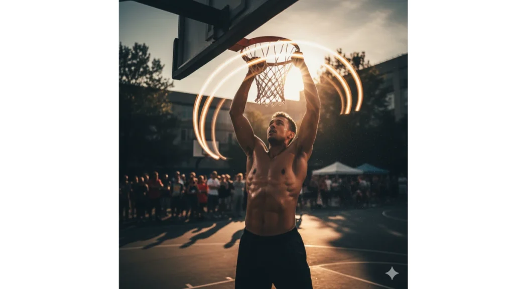 “Potret sinematik pemain basket pria di udara saat melakukan slam dunk di lapangan outdoor. Ambil dari sudut rendah untuk kesan heroik. Tambahkan efek light trail di bola dan tangan, dengan cahaya matahari senja di belakang ring. Gunakan detail otot berkilau, bayangan tajam, dan efek partikel debu yang beterbangan di udara. Fokus pada ekspresi wajah yang penuh konsentrasi.”