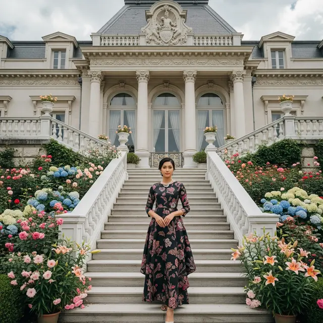 A woman in an elegant dress standing in front of a grand European-style mansion, marble staircase, cloudy sky, luxury aesthetic.