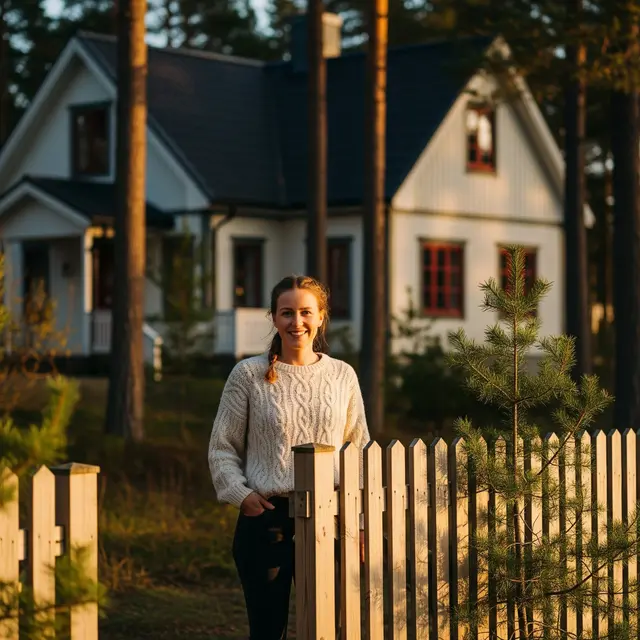 A smiling woman standing near the wooden fence of a Scandinavian-style cozy house, surrounded by pine trees, warm golden hour light, natural tones, highly detailed texture.