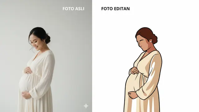 “Ubah foto menjadi ilustrasi digital minimalis dengan garis tegas dan palet tiga warna datar—beige, putih, dan terracotta. Hilangkan latar belakang dan fokuskan pada siluet ibu hamil dengan bayangan lembut.”