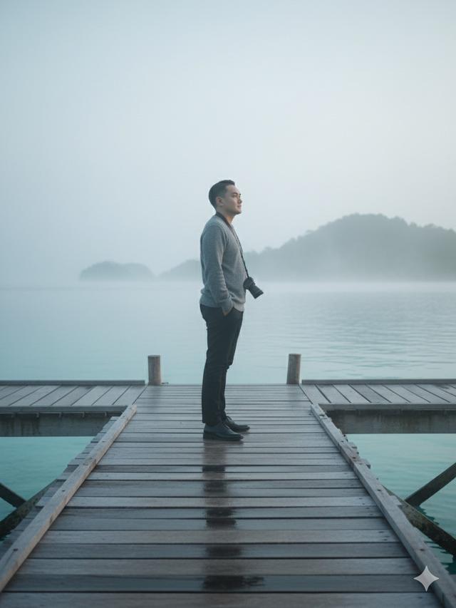 “Foto close-up bergaya travel journal, saya berdiri di dermaga kayu Desa Arborek saat pagi hari, kabut tipis menutupi permukaan laut, embun masih di udara, langit abu muda dengan cahaya lembut, suasana hening dan damai, warna lembut natural biru keabu-abuan, pakaian hangat santai, ekspresi tenang, refleksi tubuh samar di air.”