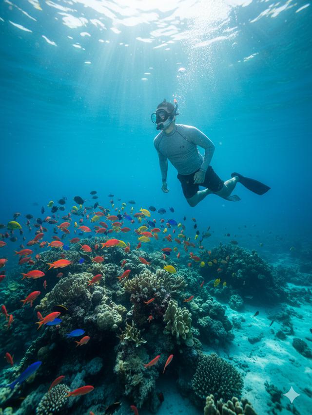 “Foto bawah laut ultra-realistik di Raja Ampat, saya sedang menyelam mengenakan snorkel dan fin, dikelilingi ikan tropis berwarna merah, kuning, biru, serta karang laut bertekstur lembut. Cahaya matahari menembus permukaan air menciptakan pola berkilau, efek kedalaman air jelas, ekspresi kagum di wajah, tone alami tanpa efek berlebihan.”