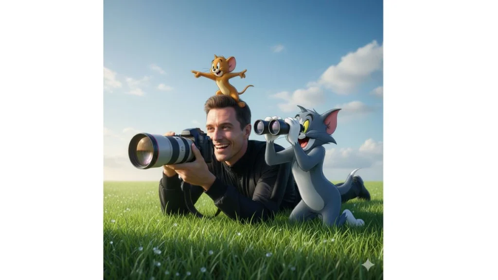 “Adegan hiper-realistis di padang rumput hijau segar saat pagi hari dengan cahaya lembut. Di depan, pria dari foto referensi berbaring sambil memotret dengan kamera DSLR profesional. Di sebelahnya, karakter kartun Tom terlihat bersemangat memegang teropong, sementara Jerry berdiri di atas kepala pria itu, menunjuk ke depan dengan ekspresi lucu. Komposisi menyatu antara dunia nyata dan kartun, dengan pencahayaan alami serta suasana ceria dan penuh petualangan.”