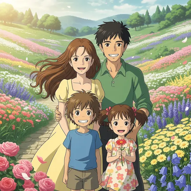 “Transform a family photo into a Studio Ghibli-style anime scene, family of four smiling in a flower garden, soft lighting, pastel color palette, cinematic depth, natural background, warm atmosphere.”