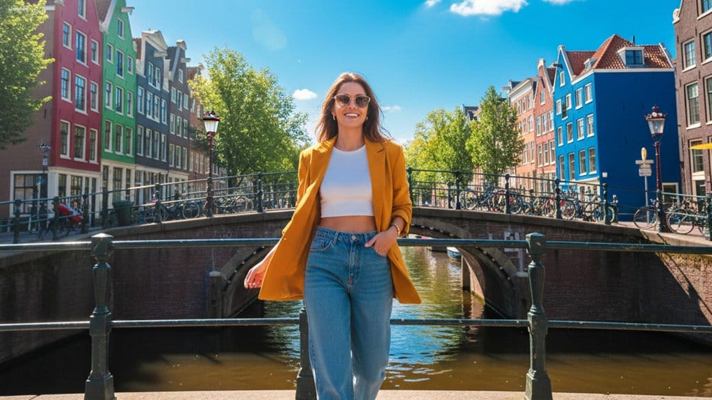 Gambar diriku berjalan di sepanjang kanal sempit di Amsterdam, tangan memegang kamera, memakai ransel vintage, dengan bangunan sempit berjajar di latar. Pencahayaan siang cerah, warna vibrant.