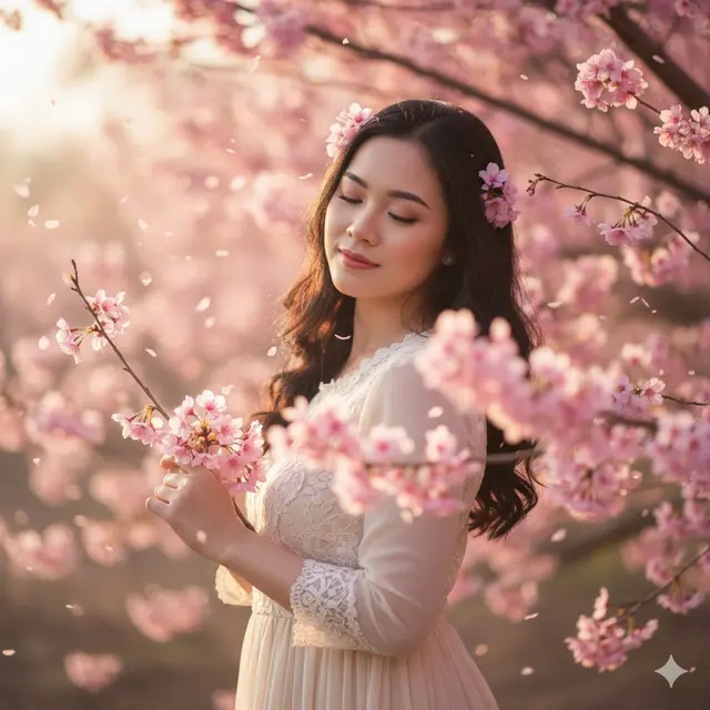 “Tampilkan subjek dengan dedaunan hijau segar dan bunga sakura putih mungil yang mengelilingi wajah. Gunakan cahaya matahari pagi yang lembut, makeup natural bernuansa peach, dan latar taman penuh bunga yang sedang mekar.”