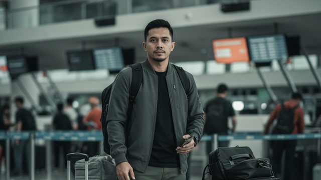 Foto travel fashion seorang pria Indonesia berdiri di area check-in bandara yang sibuk, dikelilingi koper dan troli bagasi. Ia mengenakan bomber jacket dan celana cargo, membawa ransel. Full body shot dengan pencahayaan natural studio, tone warna modern dan edgy. –ar 9:16
