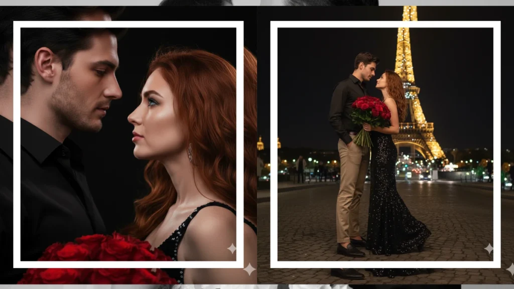 “Ciptakan gambar pasangan berdiri di depan Menara Eiffel malam hari. Wanita mengenakan gaun hitam berkilau dengan rambut panjang bergelombang. Pria mengenakan kemeja hitam dan celana krem. Keduanya saling menatap penuh cinta di bawah cahaya lampu Eiffel, sambil memegang buket bunga merah. Wajah tetap asli dan ekspresi lembut bahagia.”