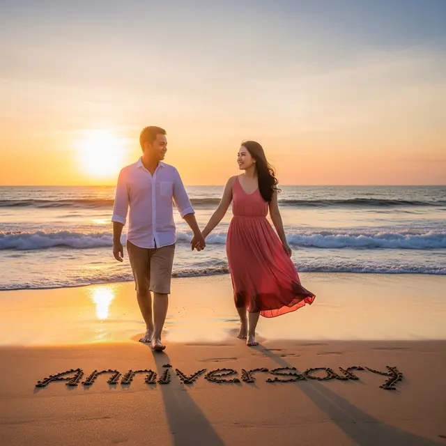 Tak ada yang lebih romantis daripada merayakan cinta di tepi pantai saat matahari terbenam. Pasangan digambarkan berjalan bergandengan tangan di pasir lembut, dengan cahaya senja keemasan menyelimuti siluet mereka.