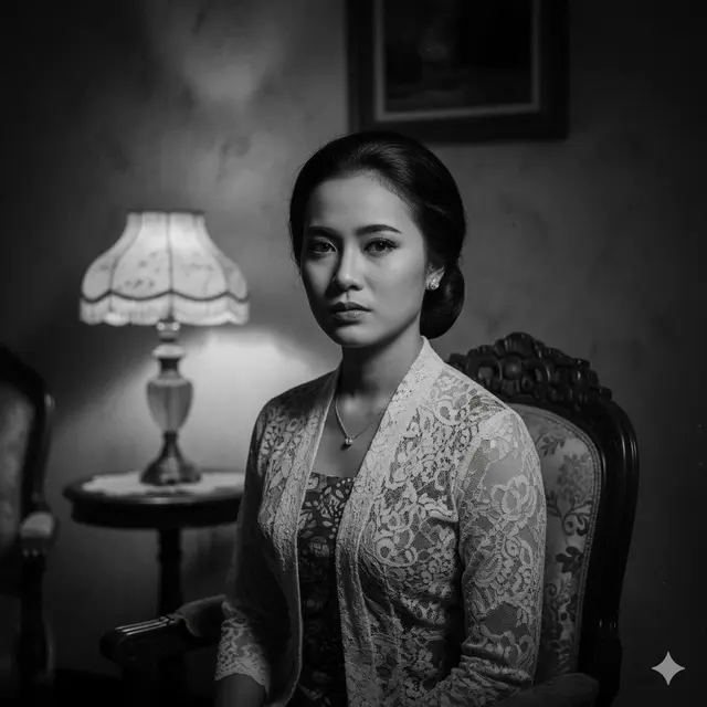 “Potret wanita Indonesia mengenakan kebaya bermotif dengan perhiasan sederhana. Ekspresi tenang, pencahayaan lembut, latar interior rumah dengan lampu meja dan bayangan lembut.”