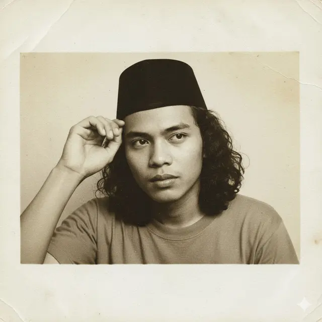 “Potret pria Indonesia bergaya retro tahun 1980-an, dengan efek foto tua yang menguning. Rambut ikal panjang, memakai peci dan kaos polos. Latar kertas bertekstur dan pencahayaan lembut.”