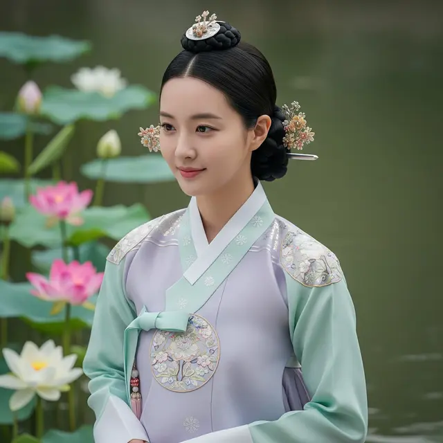 “Seorang putri kerajaan Korea berdiri anggun di depan gerbang kayu istana tradisional. Ia mengenakan hanbok pastel dengan bordir bunga sutra dan ornamen rambut emas berbentuk phoenix. Cahaya senja menyoroti wajahnya, menciptakan kesan lembut dan megah.”