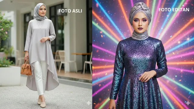 “Edit photo of a person in 90s party glam style, glitter lighting, shiny outfit, bold eyeliner, voluminous styled hijab, vibrant disco light background, realistic skin tone, retro vibe.”