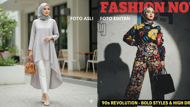Majalah fesyen 90-an punya ciri khas: pose percaya diri, warna kontras, dan pencahayaan tegas. Hasilnya tampak seperti cover majalah “Vogue” versi klasik.
