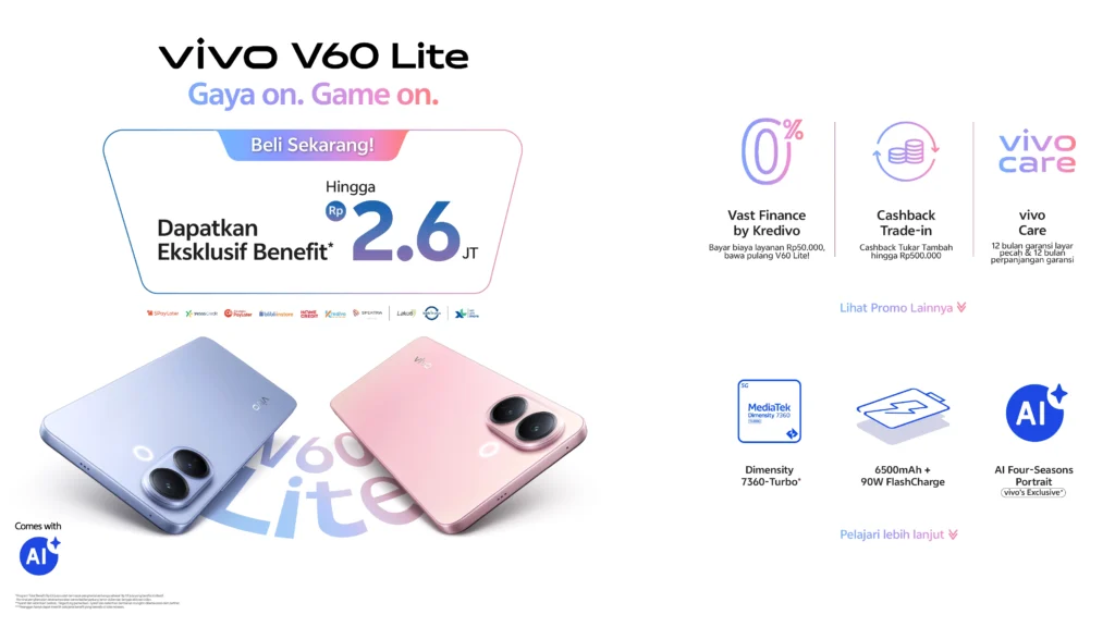 jelejahtechno.com — vivo kembali melanjutkan tradisi seri V Lite-nya dengan merilis vivo V60 Lite 5G, penerus dari V50 Lite yang sempat jadi incaran banyak pengguna karena tampilannya elegan dan baterainya tangguh. Namun kali ini, vivo membawa banyak peningkatan signifikan. Dengan desain yang lebih tipis dan ringan, baterai 6500 mAh BlueVolt, serta prosesor Dimensity 7360-Turbo yang dioptimalkan untuk gaming, vivo V60 Lite menjelma jadi smartphone mid-range yang bukan hanya stylish, tapi juga powerful.